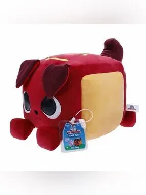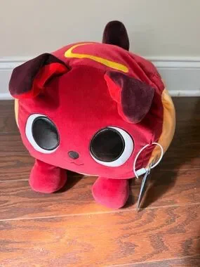 Adorable Hot Dog themed plush cube. Soft red body with yellow side panel and chocolate brown details. Large embroidered eyes and cute stitched face. Plush tag attached. Great collectible plush.