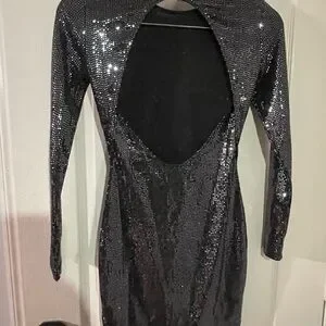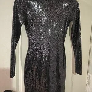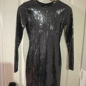 Shine bright in this sparkling silver dress. Features long sleeves. Ideal for special occasions.