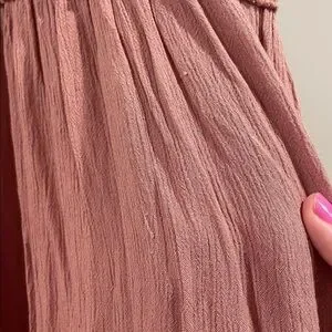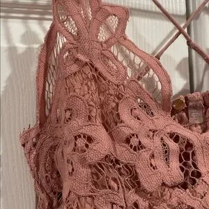 Sleeveless sundress with lace crochet bodice and crisscross back straps. Flowy skirt with layered ruffle hem. Dusty rose color throughout. Feminine and boho-ready.