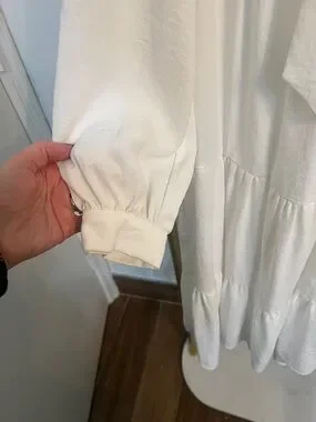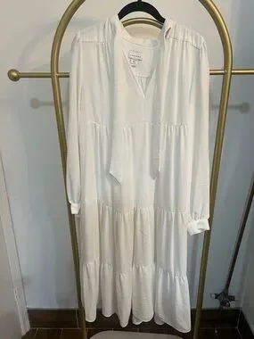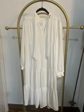 Flowing tiered maxi dress in crisp white. V-neck with attached self-tie. Long sleeves with subtle cuffs. Lightweight, airy drape for easy wear.