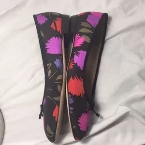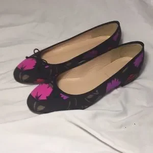 Classic black ballet flats with bright pink floral accents. Lightweight and flexible for all-day comfort. Slip-on style with a delicate bow for a polished look. Perfect for casual or office wear.