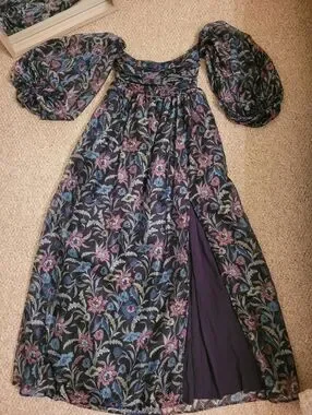 Very good preloved condition. Floral pattern. Detachable puff sleeves. Off-the-shoulders maxi dress. Smocked back bodice.