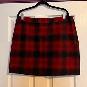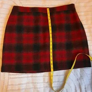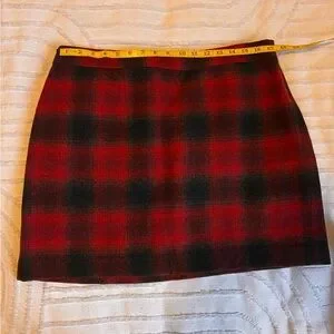 Classic 59% wool 41% rayon lined plaid mini skirt from Banana Republic. Bold red and black check pattern. Clean waistband and straight hem. Easy to style for day or night. Lightweight but structured fabric.