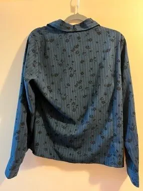 Lightweight button-front blouse with an allover floral motif. Point collar and long sleeves. Relaxed fit with soft drape for everyday wear.
