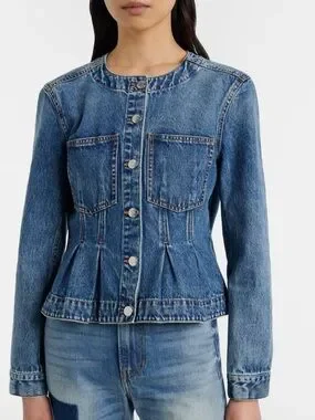 Classic Veronica Beard denim jacket in Time Warp blue. Structured peplum-inspired silhouette. Contrast copper stitching and metal logo button. Clean, wearable denim style for everyday outfits.