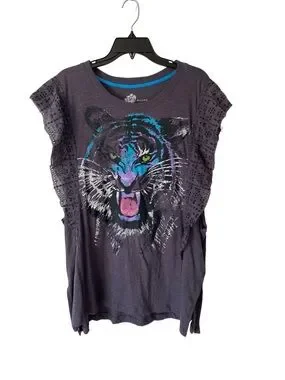 Pilcro Dark Gray Graphic Tiger Tee with Eyelet Ruffle Sleeves size large