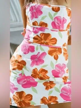 A strapless mini dress in white with bold pink and orange floral prints. Fitted, figure-flattering silhouette that highlights the waist. Lightweight, breathable fabric ideal for warm-weather wear. Stylish and versatile for daytime events or casual evenings.