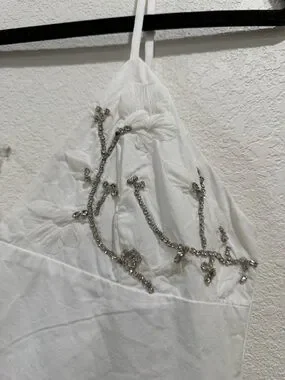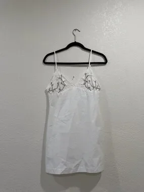 Minimal white slip dress with delicate embroidered lace cups. Thin adjustable straps for a tailored fit. Smooth lightweight fabric for easy layering. Simple, elegant silhouette for sleep or everyday wear.