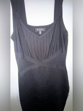 Form-fitting black tank with a V-neck. Ribbed texture at the bust. Subtle wave pattern through the body. Sleeveless, sleek silhouette. Versatile for day or night wear.
