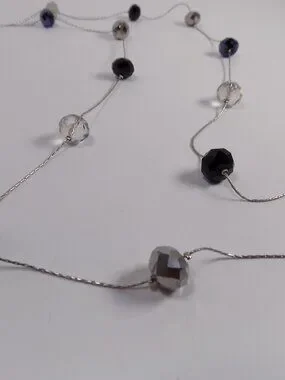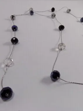 The Beads are Clear, Dark Blue and Gunmetal tone. Lobster claw closure
