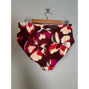 Athleta high waist bikini bottoms in a vibrant floral print featuring shades of burgundy, red, pink, and cream. These swim bottoms offer a flattering high-rise fit with full rear coverage and a comfortable wide waistband. Crafted from a premium nylon and spandex blend, they provide excellent stretch and shape retention for all-day comfort at the beach or pool.