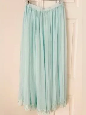 Flowy light blue maxi skirt with delicate lace trim. Soft, airy fabric creates graceful movement for daytime or evening wear. Elastic waistband offers comfortable, easy fit. Pair with a fitted top for a feminine, polished look.