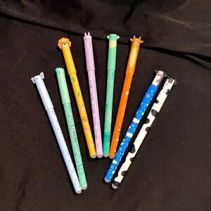 Set of 8 cute animal cap erasable gel pens in beautiful colors. Smooth writing and fun animal toppers keep kids engaged and make adults smile. Black, emerald, turquoise, blue, yellow/orange, cherry red, bright pink, and purple ink. Bottom of pen is the eraser. Perfect for schoolwork, home office, journaling, and creative play.