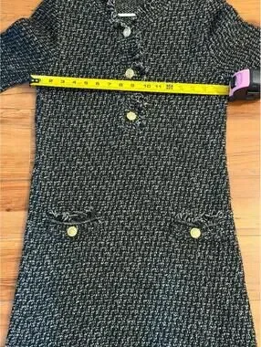 H&M short sleeve tweed dress featuring a classic black and white textured weave with statement gold-tone front buttons.Designed with frayed trim detailing at the neckline, sleeves, and hem, decorative front pockets, and a structured shift silhouette.Crafted from a medium-weight boucle-style fabric offering timeless, Chanel-inspired sophistication. Tagged size M (Women’s Medium).EXCELLENT pre-owned condition. No stains, holes, or notable flaws observed. Please review photos for full condition details.