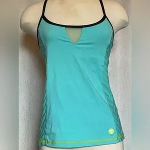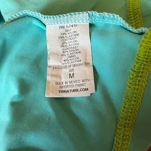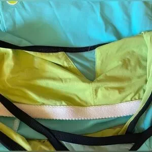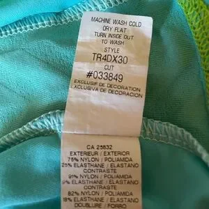 Sea foam with black edging at neckline and straps. Built in bralette. Mesh insert. Quick drying.
