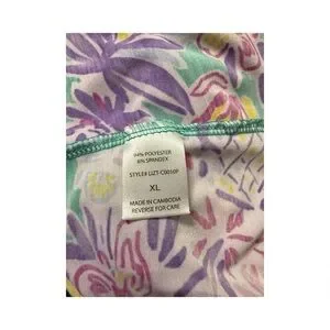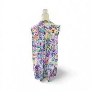 This vibrant sleeveless blouse by Dear Scarlett is perfect for sunny days and layering under cardigans or jackets. It features a colorful floral and pineapple-inspired print in shades of purple, yellow, pink, and green — a cheerful addition to your wardrobe!