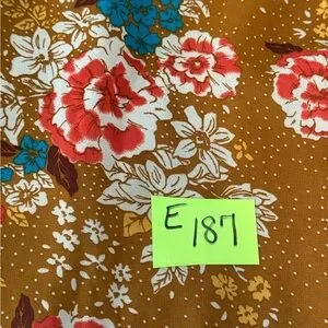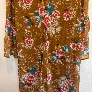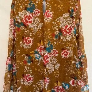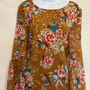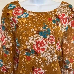 Charlotte Russe Tan, Teal, Red & White, Floral, Scoop neck, Long Bell Sleeve, Lined, Mid length Dress. Keyhole opening with button closure at back middle neckline. Business casual. Lightweight. Dressy feel. 100% polyester material. Gently used with no stains or flaws.