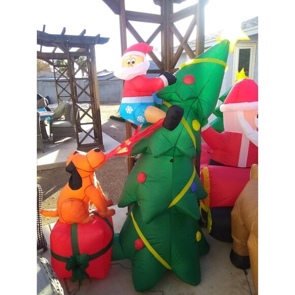 6FT Christmas Dog Chasing Santa The 6FT Christmas inflatable Dog chasing Santa Claus, and Santa climbing the tree, bringing the greatest Christmas atmosphere. Moreover, the built-in bright LED lights will light up the yard festively which is perfect for a Christmas evening party, no matter whether it is held indoor or outdoor, day or night, even in rain or snow, it will consistently provide you a beautiful and unforgettable Xmas holiday experience!