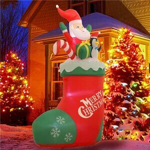 Christmas-themed Design: The 6 ft Santa inflatable showcases a festive and funny design, featuring Santa Claus and a penguin popping out of a Christmas stocking, , cheerfully greeting everyone with a candy cane and a gift box. The built-in bright LEDs make the blow up Santa more vibrant and colorful, which will definitely attract your children, neighbors and passersby at first glance.