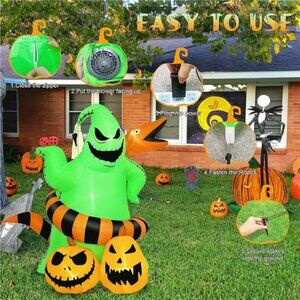 【Quick Inflation & Easy Setup】Our Halloween inflatable features a powerful fan for hassle-free setup. Plug it into a power source, and within minutes, the Green Monster, orange-black striped python, and carved pumpkin lanterns fully inflate. Secure the decoration with the included sturdy ropes and ground stakes—simply attach ropes to designated loops and plant stakes firmly in the ground. This quick process transforms your space into a spooky Halloween wonderland effortlessly.