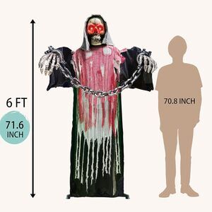 Animated Halloween Decorations: Experience ultimate fear with our life-size 72" scary Halloween animatronics! When activated, it emits creepy sounds, flashes red eyes, shakes its head, and waves arms, creating a terrifying atmosphere. Perfect for Halloween parties, haunted houses, and themed events as a standout animated Halloween decoration