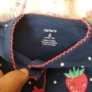 Gently used condition, no holes tears snags or stains. Carters and Little Me snap up sleep and play footie outfits and one onesie. Pink floral is Little Me, blue polka dots and white floral and onesie are Carters.