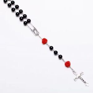 6MM Black Beaded Red Rose Rosary Necklace Women Chain Crucifix Cross Pendant