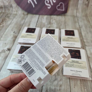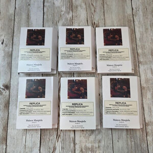 This is a set of six Maison Margiela 'REPLICA' Eau de Toilette fragrance samples. Each sample is housed in a small, rectangular white cardboard package. The front of each package features a photograph and printed details about the fragrance, including its origin and description. The back of the package contains additional information, including ingredients and manufacturing details. The items are new without tags or box.