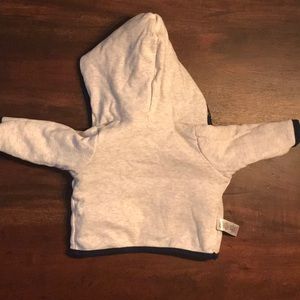 Very soft jacket that features snap closure, hood, and navy trim. Jacket is reversible and can be worn either way. One side is striped and other side is heather light gray. Only worn a few times.