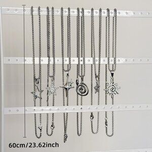 Features: A set of 6 stainless steel necklaces inspired by Y2K, grunge, goth, emo, and street fashion. Features star, vortex, pentagram, and sun motifs—perfect for self-expression and adding a spiritual touch to your look. Crafted from durable stainless steel, these necklaces are non-tarnish and built to last. Unisex design makes them easy to layer or wear solo for a statement vibe.