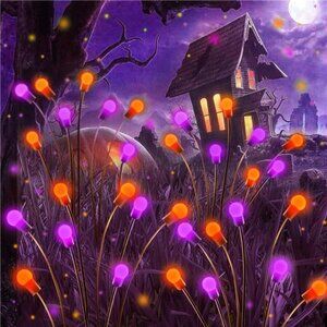 SWAYING BY WIND: Solar halloween lights swaying by the wind, as if fireflies flying in the yard; The branches are soft and flexible, and the unique design structure allows it to sway with the wind. The combination of orange and purple colors can emit eerie lighting, creating a terrifying atmosphere and fun in Halloween decorations party.
