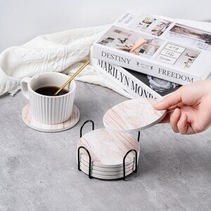 6Pcs Drink Coasters with Holder, Marble Style Ceramic Drink Coaster, Absorbent C