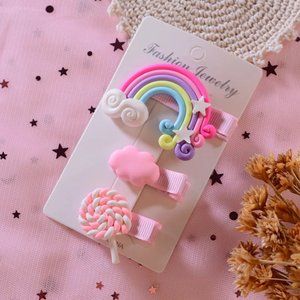 The set includes 3 adorable hairpins featuring charming designs such as clouds, lollipops, and rainbows.