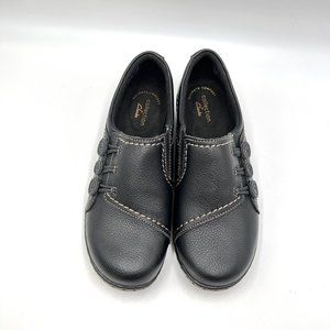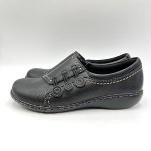 Clarks women's Ashland Effie black pebble leather slip on casual comfort shoes.
