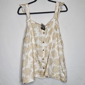 6X 30W Tan Torrid Daisy Double Gauze Ruffle Button Front Tank Top Square Neck Summer Fixed Button adjustable straps. NWT Torrid. Measurements for reference only approximately neck to hem 23" under arm to under arm 30" wt 9oz
