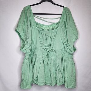 6X 30W Torrid Mint Washable Crinkle Gauze Criss Cross Back Top Stretch Lined NWT Torrid peplum silhouette square neck, short sleeve, cinched waist, back lace up detail. NWT Torrid. Measurements for reference only approximately neck to hem 22" under arm to under arm 28" sleeve inseam 3" wt 1lb