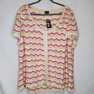6X 30W Torrid Pink Crochet Sweater Flutter Sleeve Pointelle Pullover Open Knit decorative button short sleeve. NWT Torrid. Measurements for reference only approximately shoulder to hem 30" under arm to under arm 31" sleeve inseam .5" weight 1lb 6oz