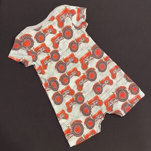 Orig $51. Adorable tractor onesie by Organic Little Wings, in infant / baby size 6 months, 6 mo, 6mo, 6m, 6 m. Short sleeves. 5-snap crotch. Shorts style. Plenty of stretch; lightweight and breathable. Light grey & light green background, red & black tractors pattern / motif. Easy on & off: "envelope fold" shoulders, so you can pull onesie down & off legs instead of over head. A fun and modern take on the farm / farmer theme. Your little farmer will look adorable!