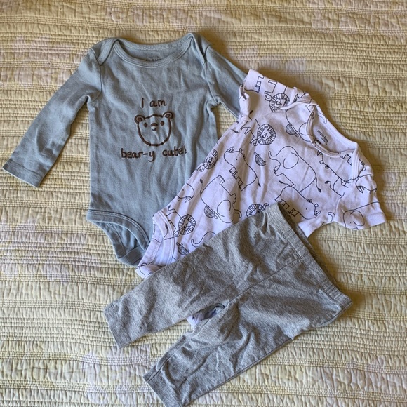 One long sleeve, one short sleeve… both with snaps. One pair of pants 3-6mo. Never worn, new condition.