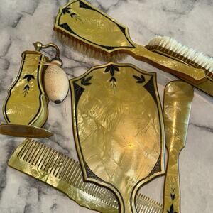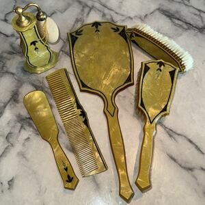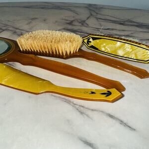 This is a vintage Art Deco vanity set, likely from the mid-20th century. These sets typically include a hand mirror, hairbrush, and comb, and are often made from materials like celluloid or bakelite.