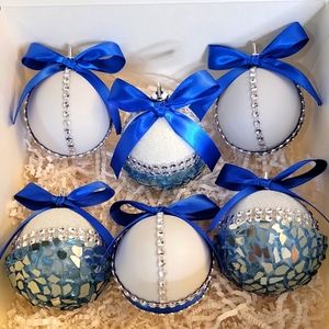 These ornaments are the epitome of elegance and class. They are beautifully handmade and uniquely designed to give your holiday decor the perfect dazzle. Each set comes with 6- 2.3in, shatter proof ornaments carefully designed with gorgeous gems, diamond wrap, crushed glass, and ribbon. This is the jewelry that your tree needs!