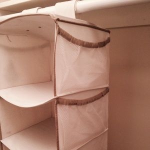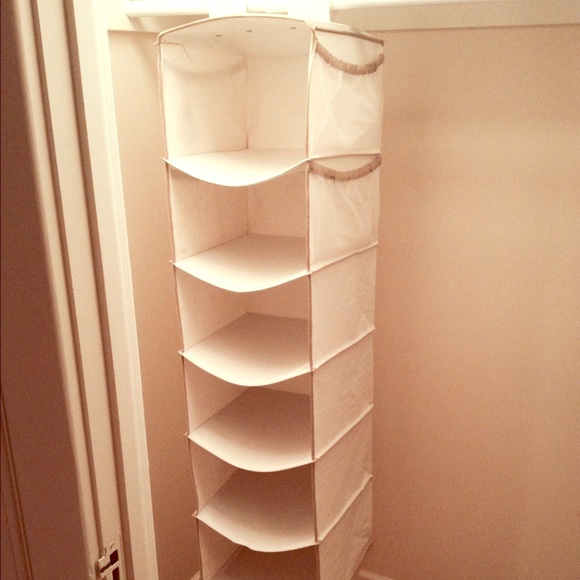 💠6 shelves 💠Collapsable 💠4 mesh pockets, 2 on each side 💠Not flimsy at all. 💠Can hold as much weight as your closet rod can handle. I've fit about 5+ pairs of jeans, yogas, leggings, or shorts on each shelf
