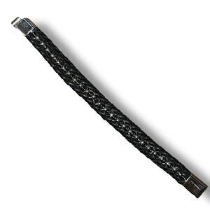 This stylish bracelet is crafted from faux leather and stainless steel. The bracelet is both durability and has a modern design. Measuring 7 1/2 inches in length, this bracelet is an ideal accessory for a sleek, understated look. The stainless steel material ensures long-lasting quality and a polished finish, making it suitable for everyday wear or special occasions.