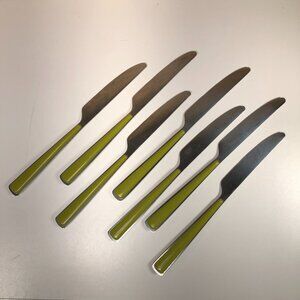 Seven (7) Cambridge Fiesta Merengue Dinner Knives. Stainless steel body with green plastic handle.