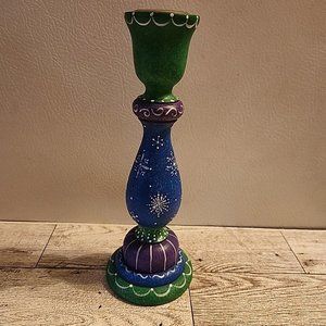 7" Colorful Wooden Candle Holder Snowflakes Purple Blue Hand Painted Made/USA