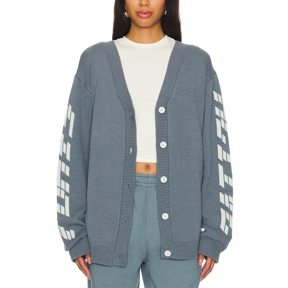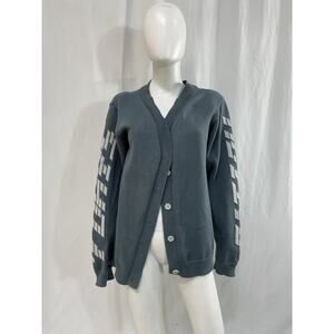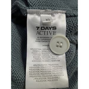 7 Days Active 'Graphic' Blue Cardigan Size XS: partial front button closure, ribbed cuffs and hem, sleeve logo detail.