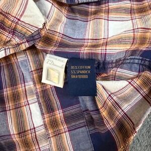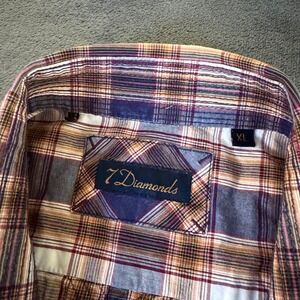 Keywords: 7 Diamonds shirt, plaid shirt, short sleeve shirt, button down shirt, menswear shirt, casual shirt, XL shirt, blue brown plaid, chest pockets, shoulder epaulettes, cotton blend shirt, stylish shirt, retro shirt, vintage style shirt