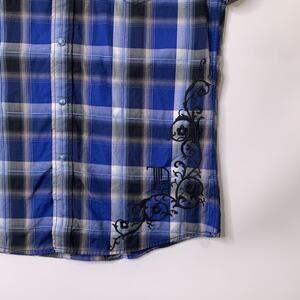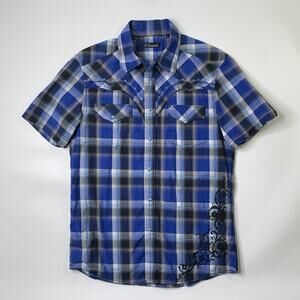 7 Diamonds Shirt Men L Large Blue Pearl Snap Buttons Plaid Western Short Sleeve