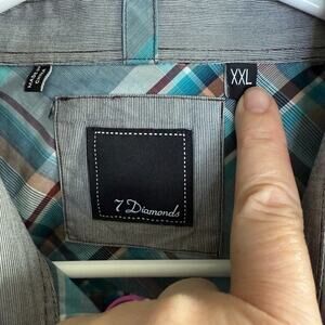 The 7 Diamonds Shirt is a men's button-up casual shirt in size 2XL with a classic green plaid pattern, short sleeves, and roll tab accents. Made of cotton, this shirt features a spread collar, button closure, and is suitable for all seasons. With a regular fit and available in a XXL size, this shirt is perfect for a casual occasion with a colorful and classic theme. Easy to care for with machine washable instructions, this shirt adds a stylish touch to any wardrobe with its spread collar and button accents.