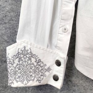 Brand: 7 Diamonds;Size: Mens Large (L); Color: White with Gray Embroidery Accents; Style: Button-Front Long Sleeve Dress Shirt; Fit: Tailored Stretch Fit; Details: Back graphic, decorative cuffs and collar, button cuffs, premium detailing; Occasion: Evening Wear, Business Casual, Western, or Smart-Casual Events